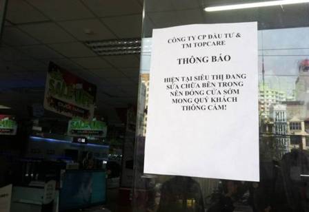 Siêu thị Topcare số 1 Hoàng Minh Giám với tổng tiền đầu tư vào khoảng 30 tỷ đồng, hoạt động 2 tháng nhưng đã bị đóng cửa và chỉ dán thông báo kiểm kê hàng. Hiện tại khi hỏi một nhân viên bảo vệ tại siêu thị này, chúng tôi nhận được câu trả lời: "Chỉ nhận được thông báo ngừng hoạt động, chúng tôi cũng không biết vì lý do gì và khi nào mở cửa trở lại".