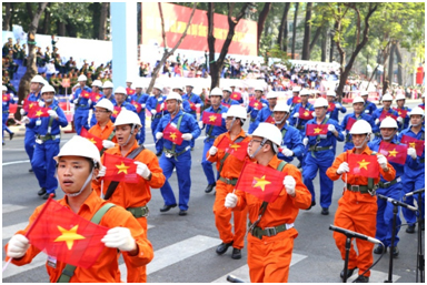 Lễ diễu binh, diễu hành bắt đầu với đội hình Quốc huy nước Cộng hòa xã hội chủ nghĩa Việt Nam, tiếp theo là khối cờ Đảng, cờ Tổ quốc và ảnh chân dung Chủ tịch Hồ Chí Minh vĩ đại. Nối tiếp là xe tăng số hiệu 390, chiếc xe tăng húc đổ cổng chính Dinh Độc Lập vào trưa 30/4/1975, đại diện các lực lượng, binh chủng và các tầng lớp nhân dân Việt Nam...