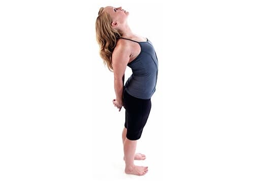 Bước 2: Hít sâu và và ngã lưng về phía sau, ưỡn ngực lên và ép vai xuống, mặt hướng lên trời, giữ yên tư thế trong vong 5 – 10 giây.