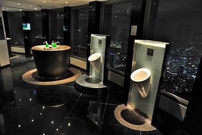 Nhà vệ sinh trên tầng cao nhất tòa nhà 63 chọc trời ở Seoul. Lá phong dán trên tường là tác phẩm của nghệ sĩ nổi tiếng hẳn hoi. Có bác nghệ nào nhà ta chịu chơi để tác phẩm của mình trong toilet không?