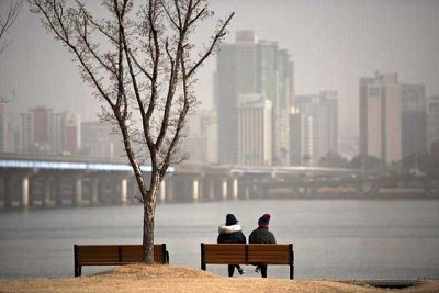 Hai người ngồi bên bờ sông Hán trong điều kiện không khí bụi mù mịt. Hằng năm cát ở các sa mạc trên đất Trung Quốc và Mông Cổ bị bão cát khuấy lên, theo gió bay sang bán đảo Triều Tiên và Nhật Bản. Hiện tượng tự nhiên này đã diễn ra suốt hàng nghìn năm, cho đến khi không khí ô nhiễm, ở các thành phố mới bùng nổ công nghiệp của Trung Quốc, hòa cũng cát tạo thành một thứ chất độc khủng khiếp. Rải rác nhiều lần trong năm, những khói độc này cũng theo làn gió bay đi khắp trời Hàn Quốc. Ảnh:Ed Jones/AFP/Getty Images