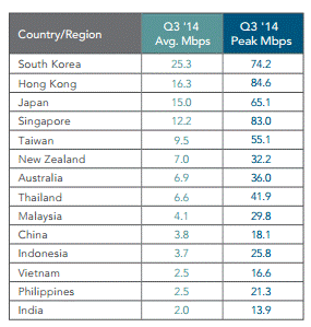 Tại khu vực châu Á – Thái Bình Dương nói riêng, Nhật Bản cùng Hàn Quốc và Hồng Kong chiếm 3 vị trí đầu bảng với tốc độ kết nối trung bình lần lượt đạt 25.3Mbps, 16.3Mbps và 15.0Mbps.
