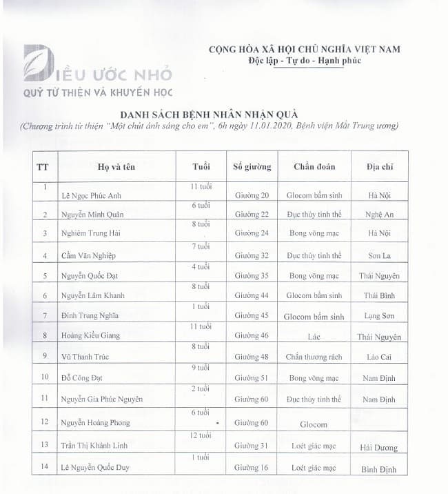 Qũy Điều ước nhỏ Kính gửi các Cô/Chú/Anh/Chị và các Bạn kế hoạch chương trình trao đi là còn mãi số 21 dành cho các bệnh nhân có hoàn cảnh khó khăn. -