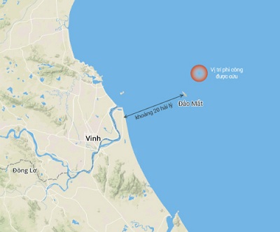Vị trí phi công được cứu sống trên vùng biển Nghệ An ở tọa độ 19,14 độ vĩ Bắc; 106 độ kinh Đông, cách vị trí nghi máy bay gặp nạn khoảng 28 hải lý về phía đông bắc đảo Hòn Mắt. Tàu của Bộ đội biên phòng đang trên đường tiếp cận với tàu cá.