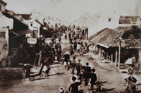 Phố Hàng Mắm với đoàn người gánh các thùng gỗ đựng mắm từ bến sông vào các cửa hàng.