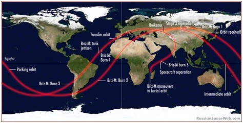 Quỹ đạo theo tính toán của tên lửa đẩy vệ tinh Ekspress-Amu1 của Nga.