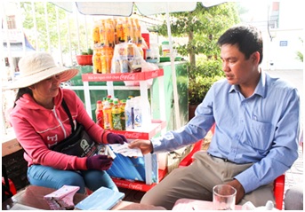 Ông Trần Hưng ở TP Trà Vinh (trái) tỏ ra dè dặt khi bán vé số điện toán in sẵn, vì địa phương này chưa được gắn thiết bị đầu cuối. Ảnh: Việt Tường.