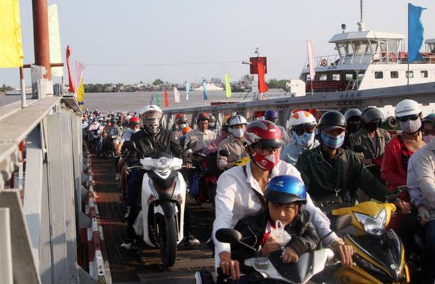 Hàng người từ hướng Đồng Nai, Vũng Tàu qua bến phà Cát Lái cũng ùn ùn đổ về TP HCM. Theo xí nghiệp phà Cát Lái, trong ngày mùng 4 Tết, lượng khách tăng 30% so với ngày thường, riêng ngày 5 Tết lượng khách tăng khoảng 10%. Ước tính lượng khách trong những ngày gần đây tăng khoảng 65 đến 70 nghìn lượt