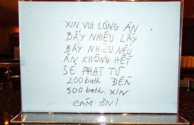 Thông báo của cửa hàng buffet ở Thái Lan đối với du khách Việt (tháng 9-2012). Ảnh: INTERNET