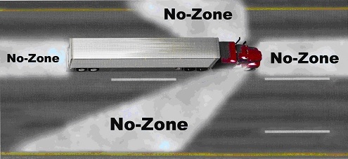 3. Hãy tránh "Điểm Mù - NO-ZONE". Giống như các xe ô tô khác, nguyên tắc an toàn trên hết của xe tải là "trông thấy và được trông thấy". Xe tải có khu vực che khuất tầm nhìn rất rộng ở cả hai bên, trực diện và đằng sau. Hãy tránh những vùng đó càng xa càng tốt. Nếu bạn đi sau một chiếc xe tải mà bạn không trông thấy gương chiếu hậu của nó, điều đó nghĩa là bác tài xe tải cũng không nhìn thấy bạn.