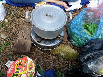 Một cách nấu nướng được cho là “lịch sự” của dân phượt khi đoàn phượt mang sẵn cả mì hộp, rau, xoong nồi hay bếp cồn khô