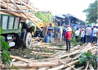 Khoảng 1h sáng 9/5, ôtô khách giường nằm từ Ninh Bình vào Nam, khi đến xã Bình Hiệp, huyện Bình Sơn (Quảng Ngãi) thì đối đầu xe tải chở gỗ keo chạy ngược chiều.