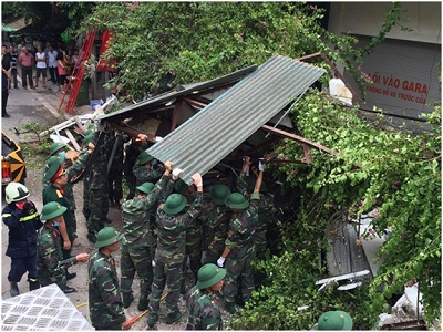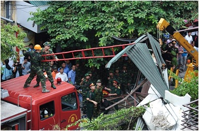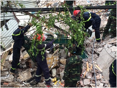 Căn nhà 4 tầng rộng gần 50 m2 trên phố Cửa Bắc (Ba Đình, Hà Nội), đổ sập lúc 3h30 sáng 4/8, đây là cửa hàng ăn uống, có 11 người ở bên trong. Ngay khi nhận được tin báo, công an, Cảnh sát PCCC, các lực lượng quân đội Hà Nội huy động nhiều phương tiện cùng gần 100 cán bộ chiến sỹ đến hiện trường tìm kiếm người bị mắc kẹt.