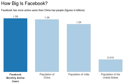 Facebook thông báo hiện họ đã có tới 1,39 tỷ người dùng tích cực mỗi tháng (active user). Trong khi đó, dân số của Trung Quốc, nơi Facebook gần như bị chặn hoàn toàn, là khoảng 1,36 tỷ người.