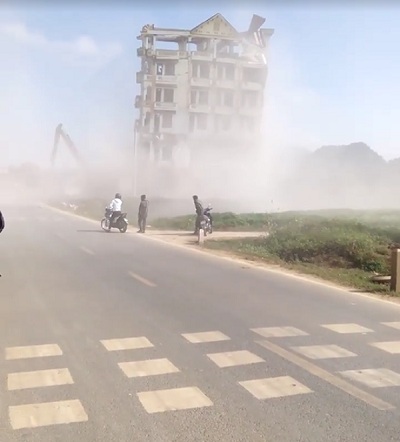 Một người dân cho biết, việc phá hủy ngôi nhà được thực hiện bằng máy xúc công suất lớn, các tầng phía dưới được tháo dỡ trước, sau đó để lộ hàm ếch cho các khối bê tông phía trên của tòa nhà sập xuống.