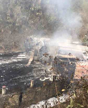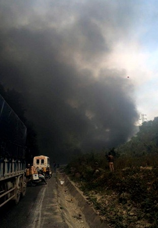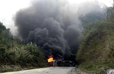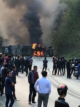 Sau cú va chạm giữa xe khách và xe chở nhựa đường, nhựa đường tràn ra lênh láng, gặp nguồn lửa đã bùng cháy dữ dội gây khói đen kịt một khoảng trời. Ít nhất 3 người tử vong trong vụ việc, 26 người phải nhập viện cấp cứu...