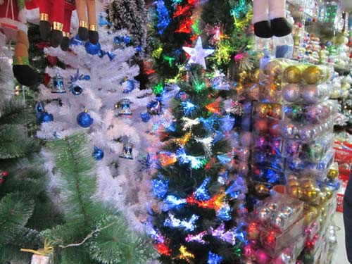 Cây thông Noel, đèn trang trí rực rỡ sắc màu được bày bán trên khắp con phố Hà Nội.