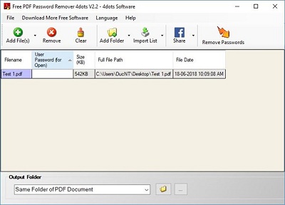Với công cụ này người dùng chỉ cần kéo thả các tập tin PDF vào giao diện chính của ứng dụng này, nhập mật khẩu vào cột User Password (for Open), nhấn nút Remove Password là hoàn tất.