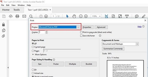 Bước 3: Tại cửa sổ Print, nhấn vào trình đơn thả xuống Printer, chọn Microsoft Print to PDF và nhấn Print/OK.