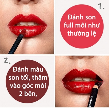 Nếu bạn sở hữu đôi môi thiếu cân đối hoặc quá mỏng, có thể giải quyết một cách đơn giản chỉ bằng kem che khuyết điểm và chì kẻ môi. Thoa kem che khuyết điểm lên toàn bộ môi để xoá đường viền môi cũ, dùng chì định hình lại viền môi và bôi son theo đường viền mới là xong.