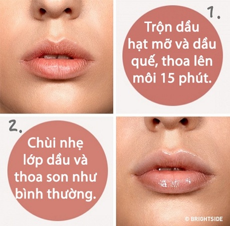 Dầu quế có tác dụng làm tăng tuần hoàn máu, giúp môi sáng màu và đầy đặn hơn. Dầu hạt mỡ lại tạo lớp bảo vệ mềm mại, căng bóng cho môi. Hỗn hợp dầu này có thể dùng thay cho son bóng.