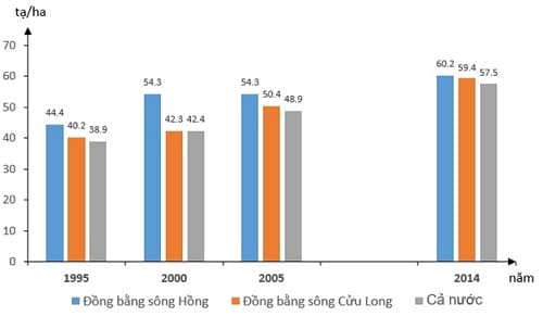 (Năm 2014: cả nước: 57,5 tạ/ha; đồng bằng sông Hồng: 60,2 tạ/ha > 57,5 tạ/ha; đồng bằng sông Cửu Long: 59,4 tạ/ha > 57,5 tạ/ha). => nhận xét A đúng.