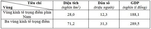 + Thể hiện tỉ trọng (về diện tích, dân số, GDP) của vùng kinh tế trọng điểm phía Nam so với 3 vùng kinh tế trọng điểm.
