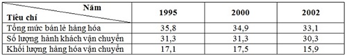 - Khối lượng hàng hóa vận chuyển chiếm 15,9 % so với cả nước, có xu hướng giảm từ 17,1% (1995) xuống còn 15,9% (2002).