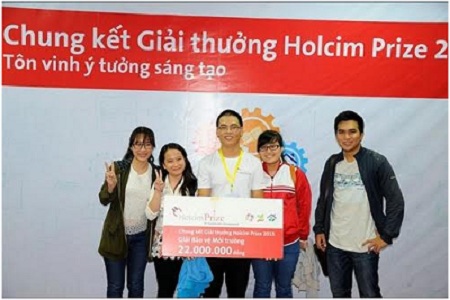 Nguyễn Phan Hoàng Phúc (áo trắng) nhận giải bảo vệ môi trường tại cuộc thi Holcim Prize 2015.